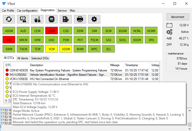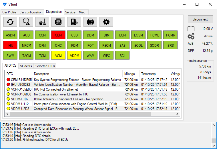 • Added details for DTC diagnostics, where you can view the date and time of the error occurrence, mileage, and other useful information provided by the control unit.