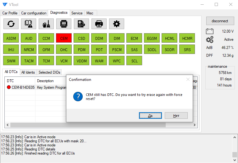 • A force-reset mode for the ECU has been added to the DTC clearing functionality. Sometimes DTC cannot be cleared during the current operating cycle, so the module is rebooted, and the error is cleared again automatically. Exceptions: SRS, VCM, VGM, IHU, and CSD modules for iCUP vehicles, which are not rebooted automatically. DTC must be cleared with the engine turned off in Inactive / Convenience / Active modes. In Driving mode, automatic module reboot does not occur, and some DTC may not be cleared.