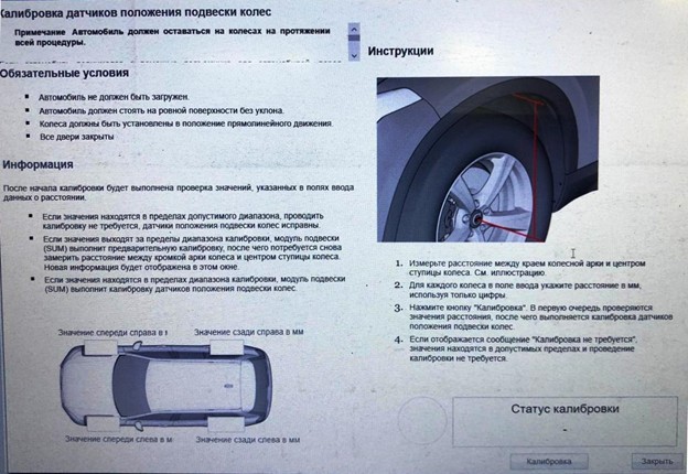 Запустить процедуру адаптации, сделать замеры от центра колеса до арки, внести показания в окне и нажать кнопку. В результате увидеть, что всё успешно. Калибровку можно запустить и без необходимости. Вида не позволяет это сделать, если и так всё нормально, но в VTool я это ограничение добавлять не буду