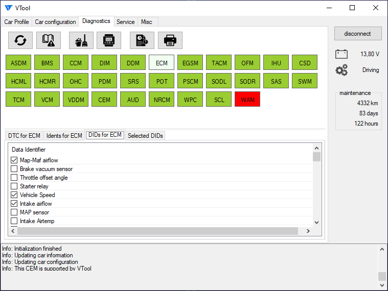VTool умеет отображать параметры (Data Identifier или DID), выдаваемые электронными модулями управления.